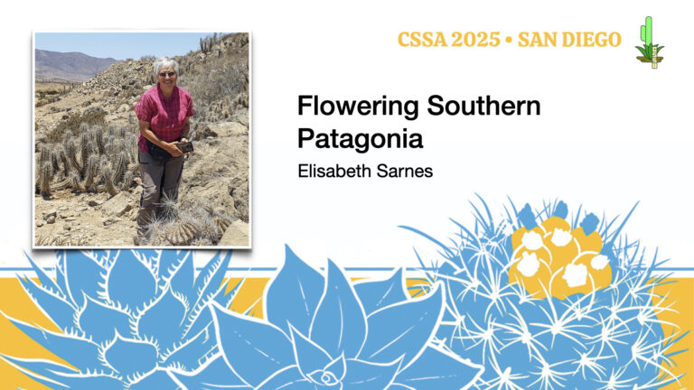 Elisabeth Sarnes presents findings from her and her husband Norbert's botanizing trip to Southern Patagonia, including flora, fauna, culture, and an abundance of flowering cacti.